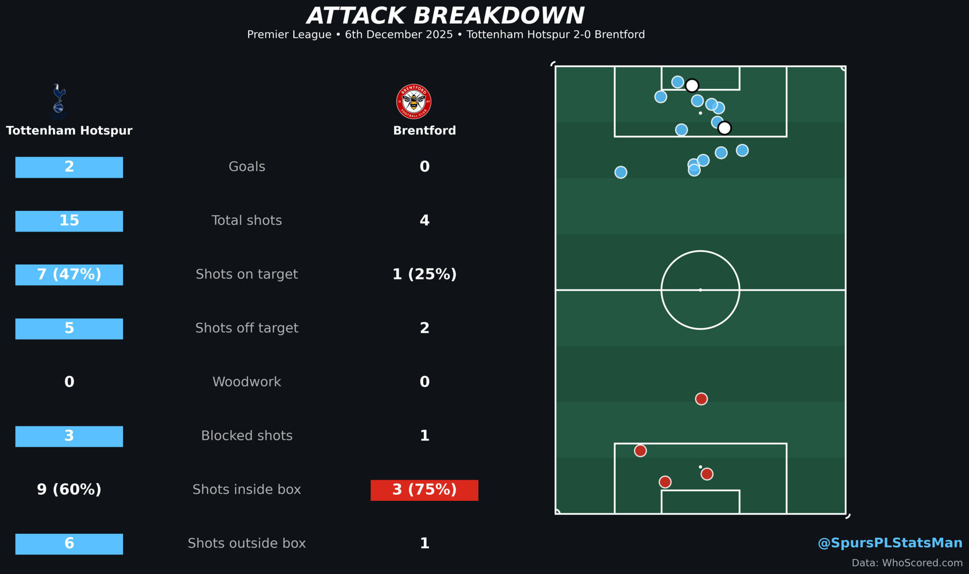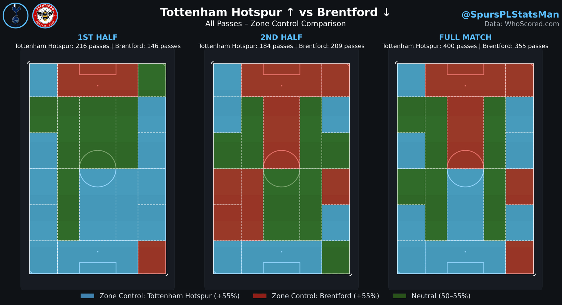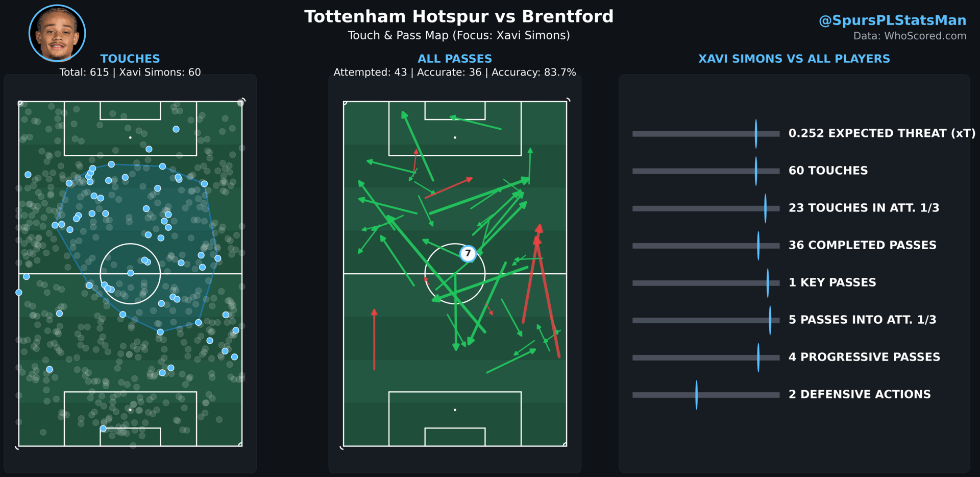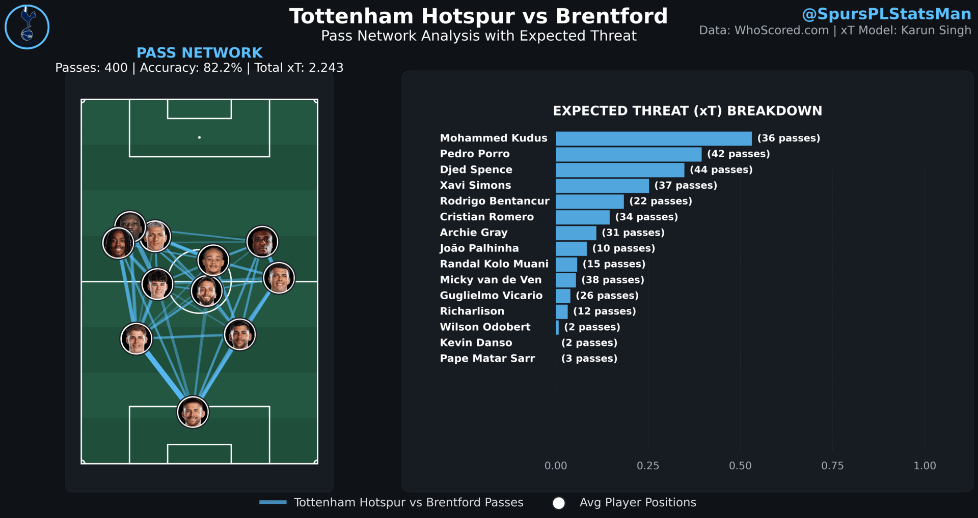 Micky van de Ven completed 38 passes, the most out of any Tottenham player. For Brentford it was Nathan Collins with 59.