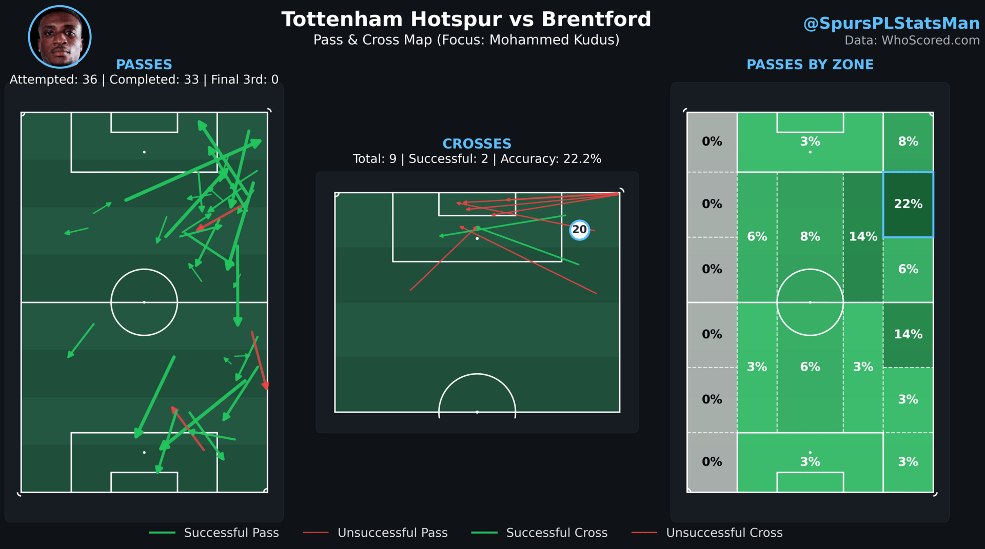 Mohammed Kudus was the highest performer of xT (0.53) out of any player. 33 completed passes is the 3rd most he has made in a game this season (highest is 41 vs Fulham).